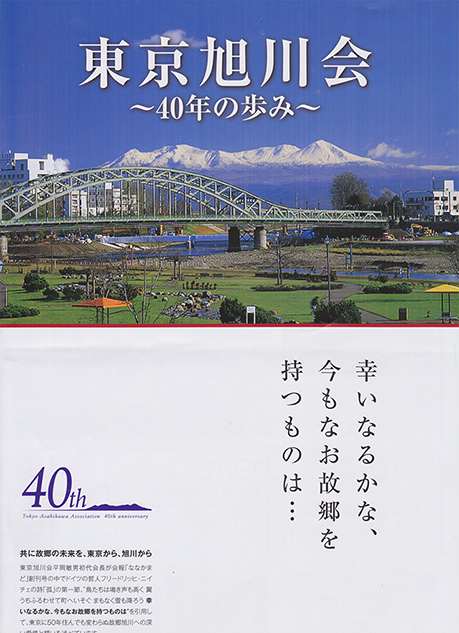 東京旭川会は昭和52年10月、ホテルニュージャパンにおいて159名の参加者を得て創立総会が開催されました。以後回を重ねて平成28年10月、40回の節目を迎えております。創立当初から毎年一回、総会・懇親会を開催して会員相互の親睦を図り、懇親の輪を拡げています。